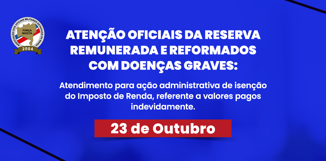 No dia 23 de outubro haverá atendimento exclusivo aos associados da Reserva Remunerada e Reformados, com o objetivo de orientar sobre a isenção do imposto de renda pago indevidamente.