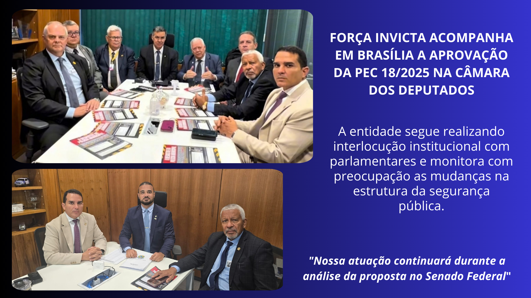 A Força Invicta continuará acompanhando atentamente a tramitação da matéria no Senado, mantendo diálogo institucional com parlamentares e entidades representativas para contribuir com o aprimoramento do sistema de segurança pública brasileira.