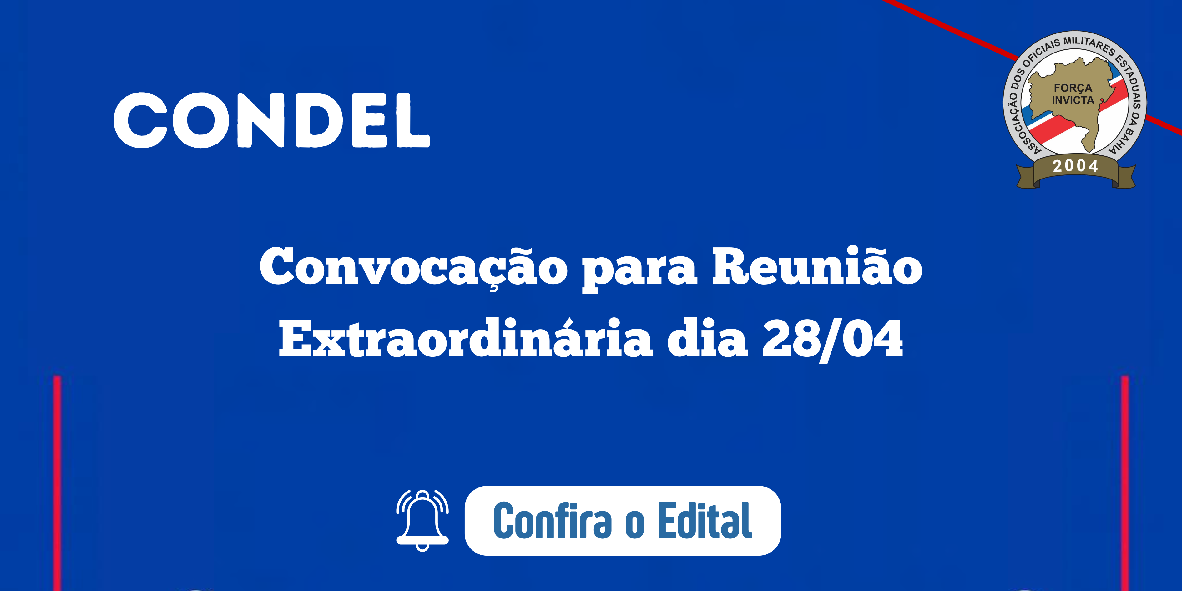 O Presidente do Conselho Deliberativo da Associação dos Oficiais Militares Estaduais da Bahia – Força Invicta, Tenente-Coronel PM RR Lindemberg Augusto Ferreira Serrão, no uso das atribuições que lhe são conferidas pelo Estatuto da entidade, convoca os(as) Ilustríssimos(as) Conselheiros(as) para participarem da Reunião Extraordinária virtual, a ser realizada no dia 28 de abril de 2026, às 18h30 (primeira chamada) e às 19h (segunda chamada).