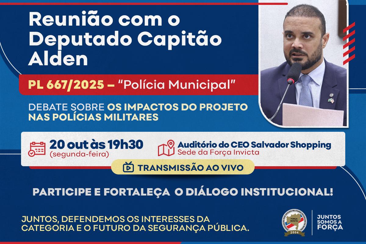 Na próxima segunda-feira, dia 20 de outubro, às 19h30, você, associado e associada da Força Invicta, tem encontro marcado com o deputado federal e também associado da entidade, Capitão Alden.
