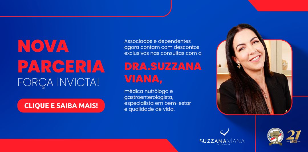 A Força Invicta firmou mais uma parceria que reforça seu compromisso com a saúde e o bem-estar de seus associados e dependentes. A nova parceira é a Dra. Suzzana Viana, médica especialista em Nutrologia e Gastroenterologia, reconhecida por sua atuação em abordagens integradas e personalizadas.