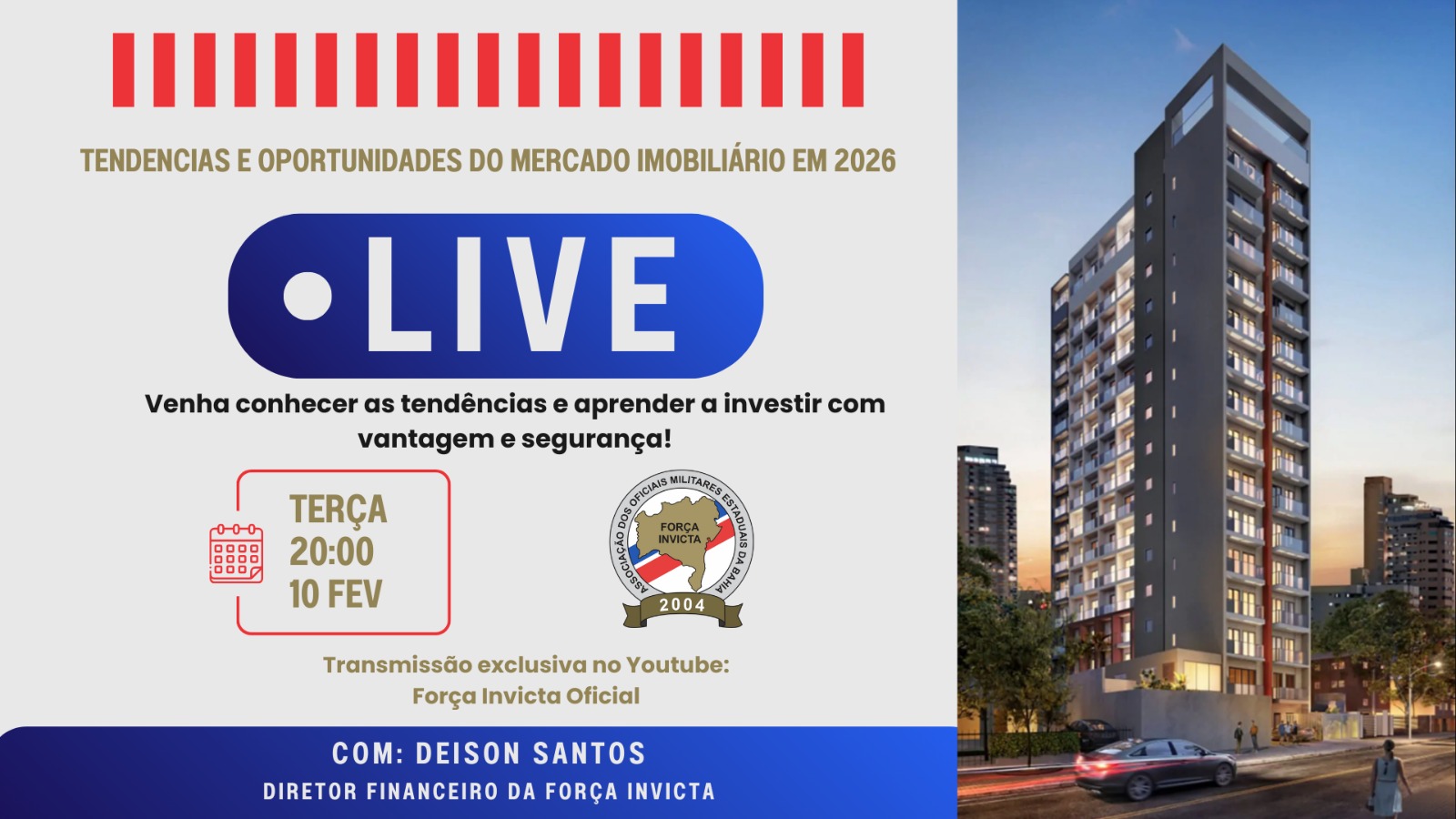 A Força Invicta promove, no dia 10 de fevereiro, às 20h, uma live especial com o diretor financeiro, Cap PM Deison Santos, que abordará o tema “Tendências e Oportunidades do Mercado Imobiliário em 2026”.