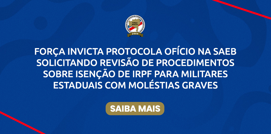 A Força Invicta protocolou um ofício junto à Secretaria da Administração do Estado da Bahia (SAEB) solicitando a revisão de procedimentos e a reavaliação administrativa relativos à isenção do Imposto de Renda Pessoa Física (IRPF) para militares estaduais portadores de moléstias graves, associados à entidade.
