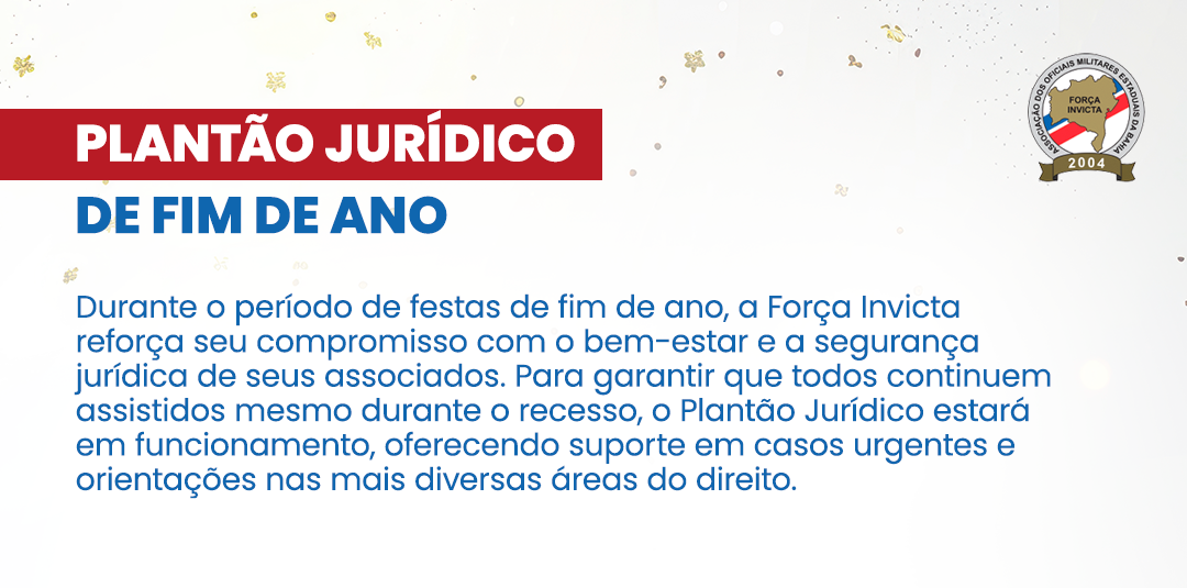 Durante o período de festas de fim de ano, a Força Invicta reforça seu compromisso com o bem-estar e a segurança jurídica de seus associados. Para garantir que todos continuem assistidos mesmo durante o recesso, o Plantão Jurídico estará em funcionamento, oferecendo suporte em casos urgentes e orientações nas mais diversas áreas do direito.