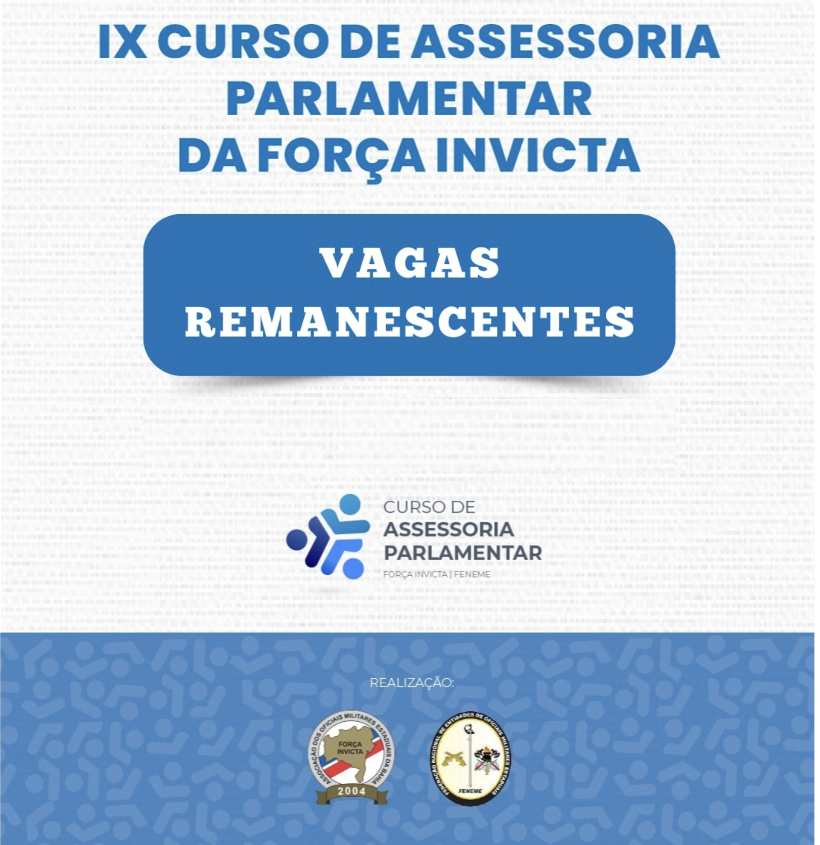 A Força Invicta informa que, conforme previsto em edital, o não preenchimento das vagas ofertadas para a 9ª edição do Curso de Assessoria Parlamentar (CAP) resultou na redistribuição das mesmas entre os associados suplentes regularmente inscritos.