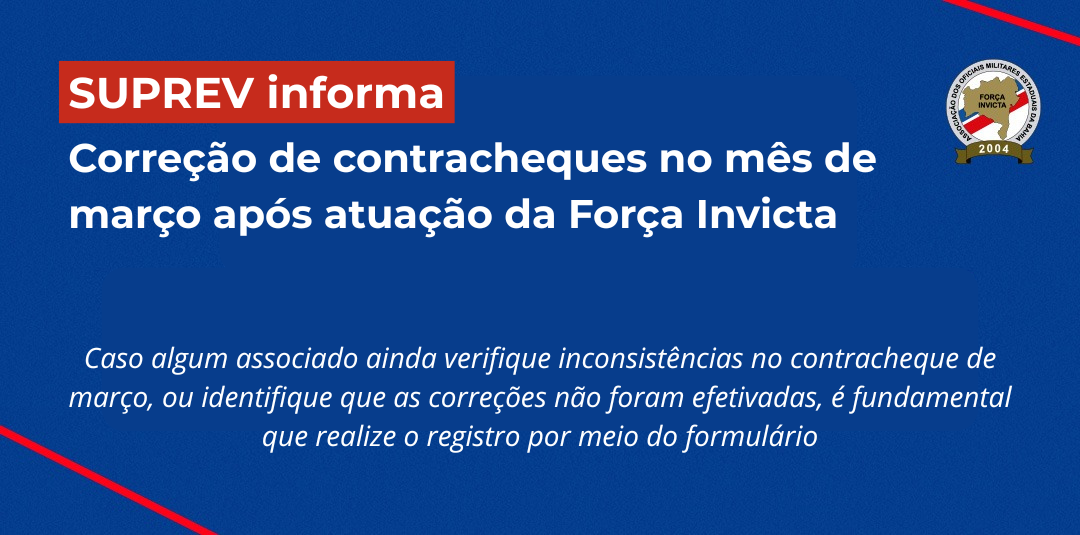 A Força Invicta informa aos seus associados que recebeu, nesta quinta-feira (27), ofício da SUPREV comunicando que as inconsistências identificadas nos contracheques foram devidamente analisadas e que as correções já constam na folha de pagamento do mês de março.